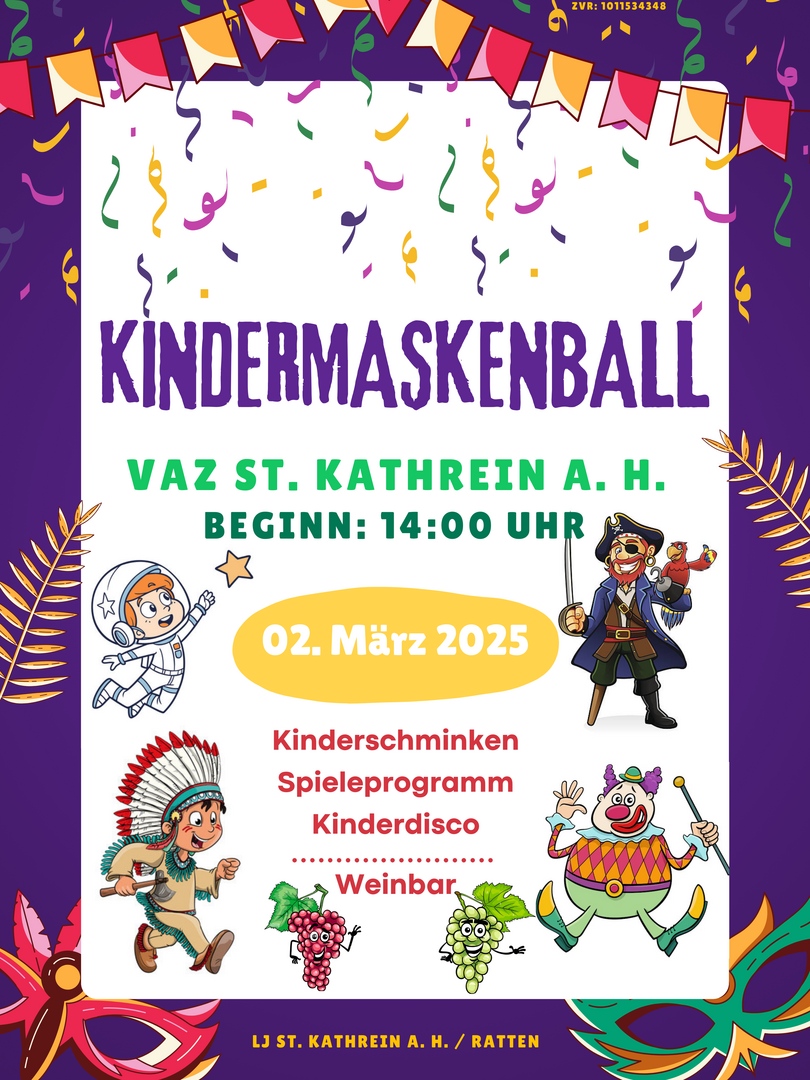Daher laden wir euch am Sonntag, dem 02. März, um 14 Uhr ins VAZ St. Kathrein a. H. zum Kindermaskenball ein!