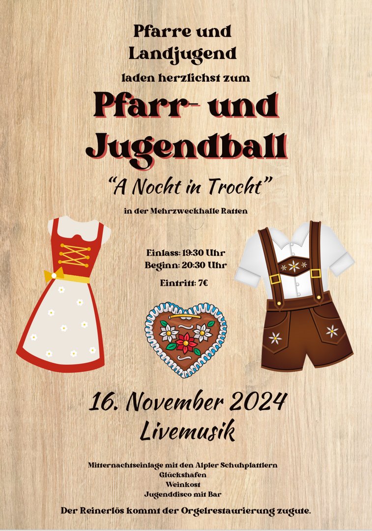 Am Samstag, den 16. November, findet heuer wieder der Pfarr-und Jugendball in der Mehrzweckhalle Ratten statt.🤩